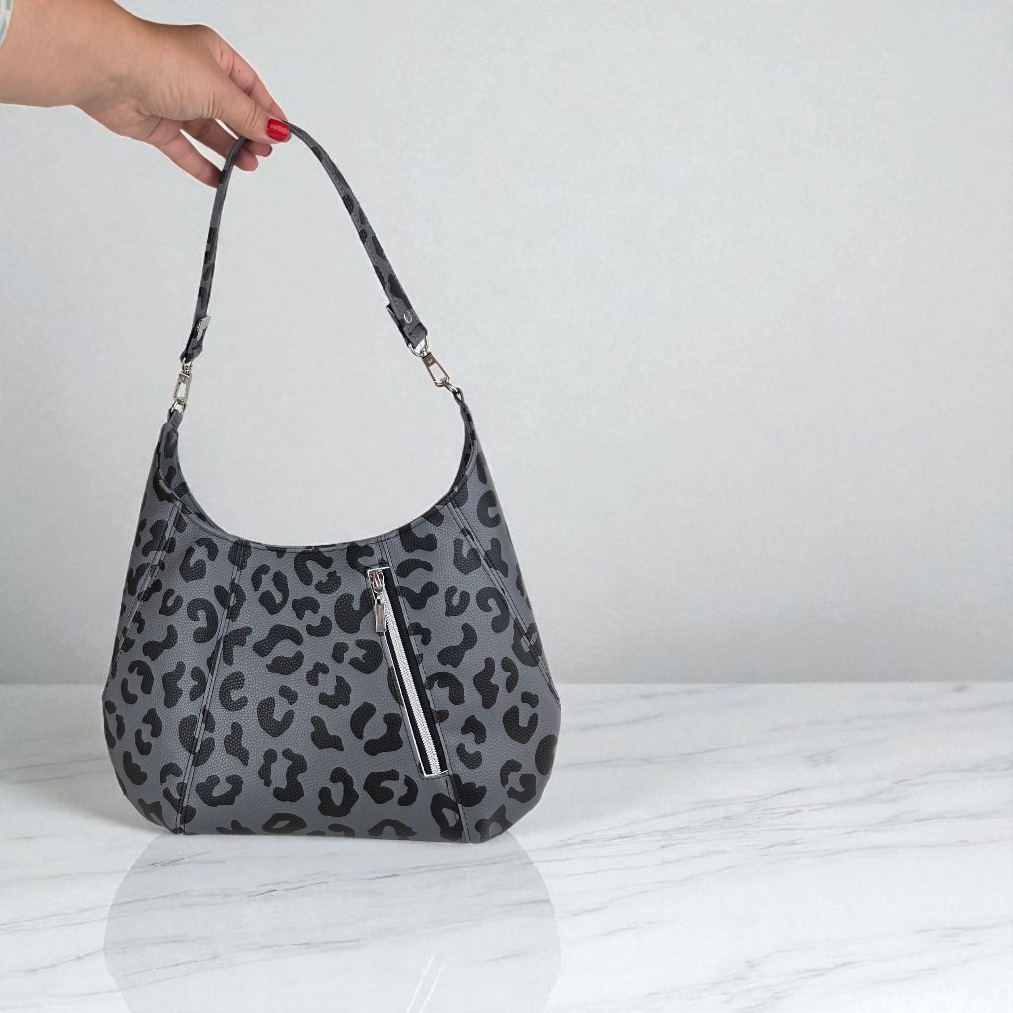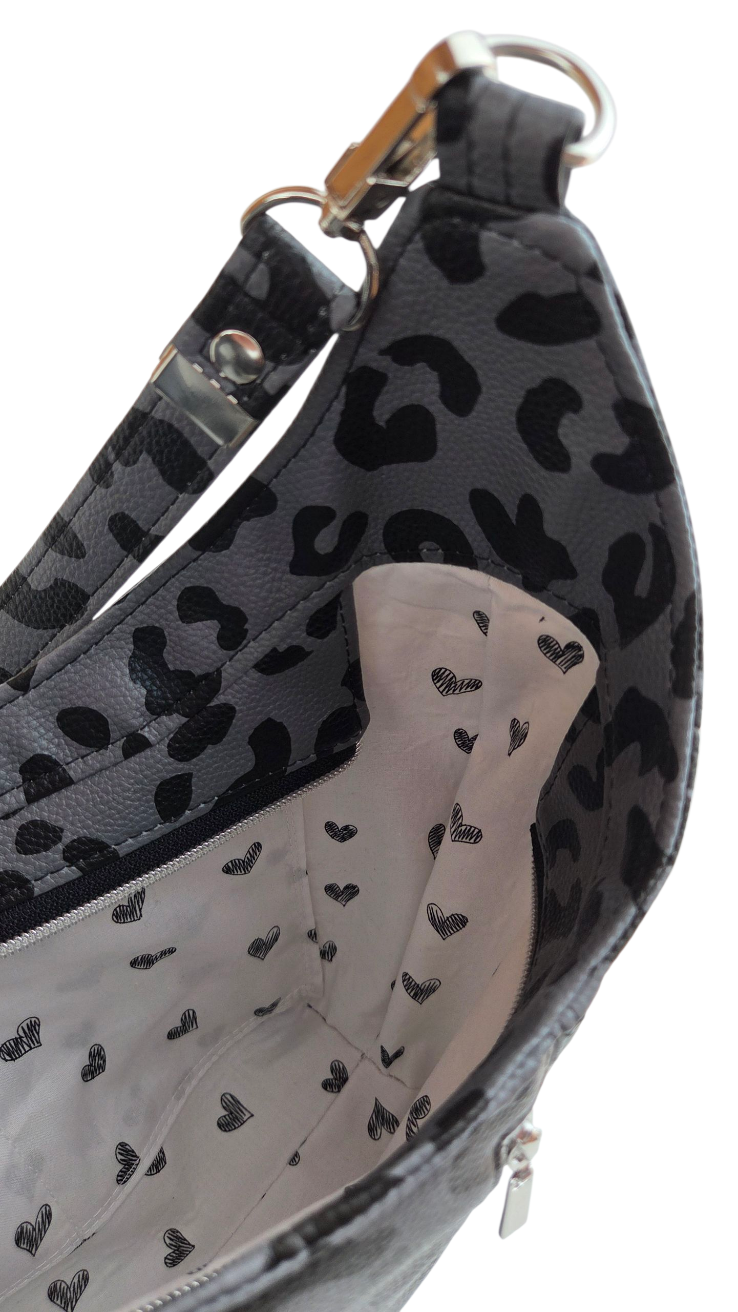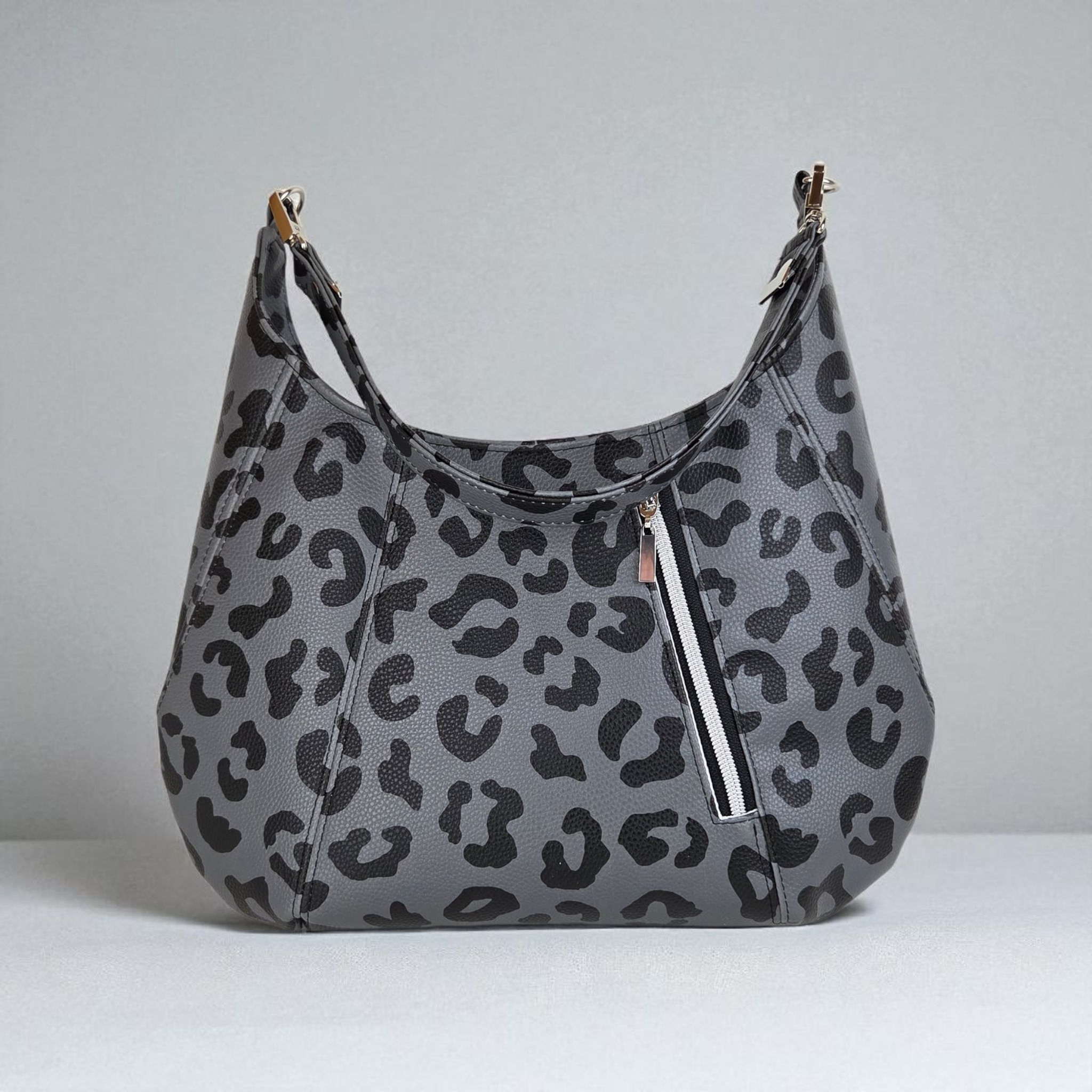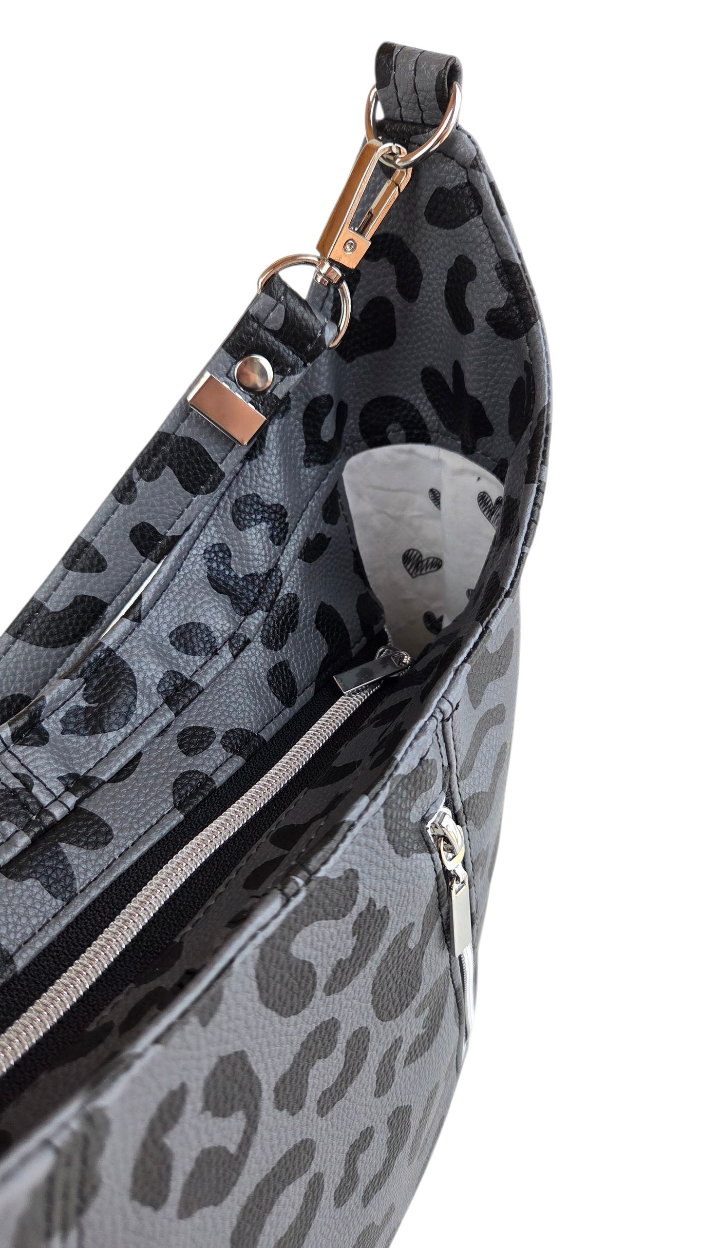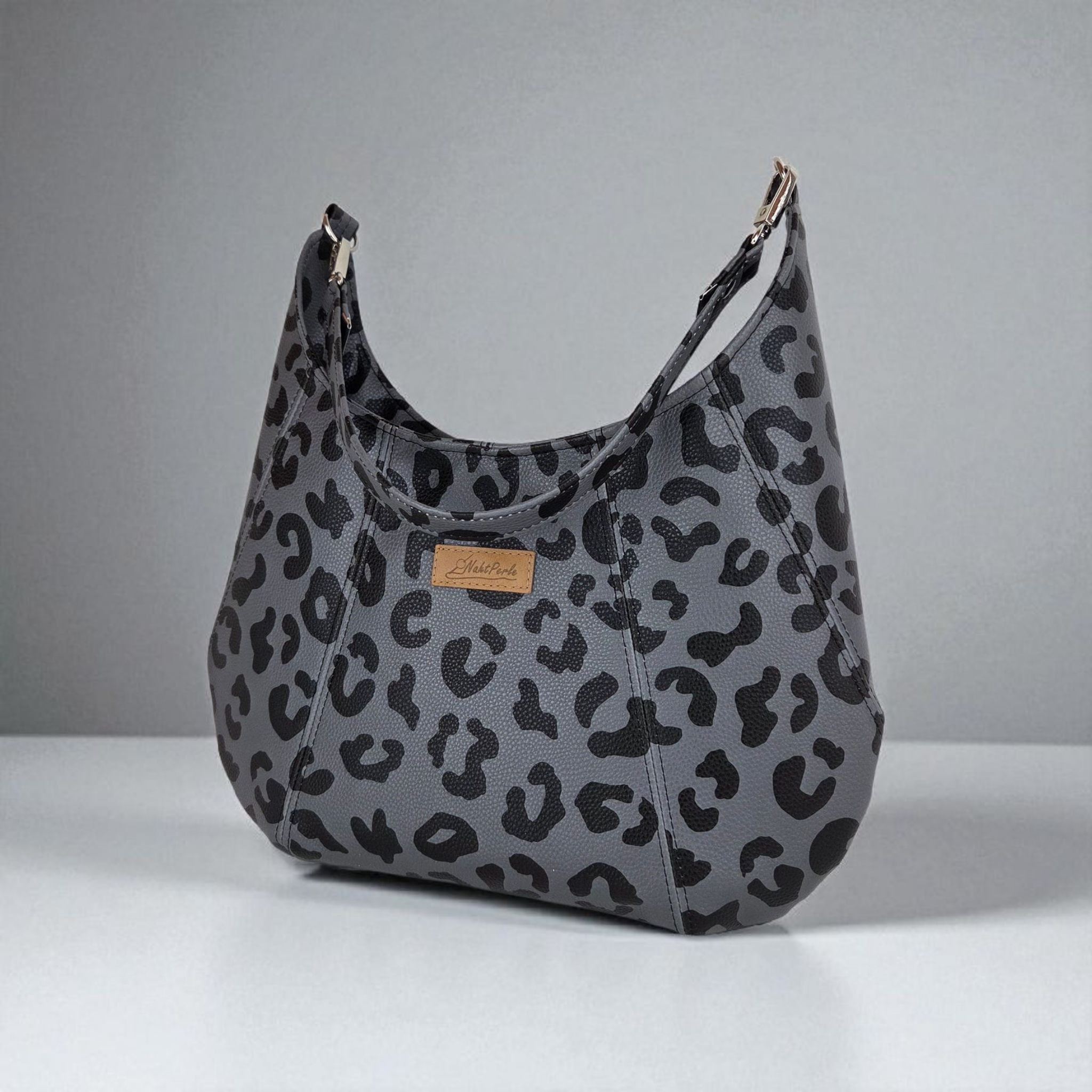 Ich bin FrauChiara, deine Schultertasche mit Charakter und Herz. Mein stylischer Leo-Look in Grau-Schwarz zeigt deine wilde Seite, während mein Innenfutter mit kleinen, liebevoll gezeichneten Herzen für eine verspielte Überraschung sorgt. Ich bin genau die Richtige für dich, wenn du gern auffällst, aber dabei auf Eleganz und Raffinesse setzt. Mit meinem durchdachten Innenleben und robustem Design bin ich alltagstauglich – aber alles andere als gewöhnlich.